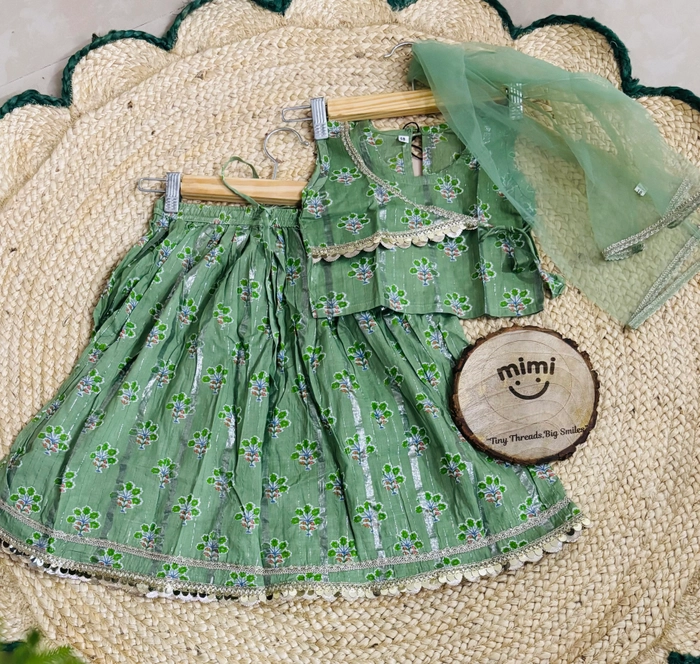 Make every celebration special with our Green Heritage Lehenga Choli Set. Designed in a beautiful green shade with elegant detailing, this outfit adds a royal and festive touch to your little one’s look. Ideal for weddings, festivities, and family functions, it offers both style and comfort.