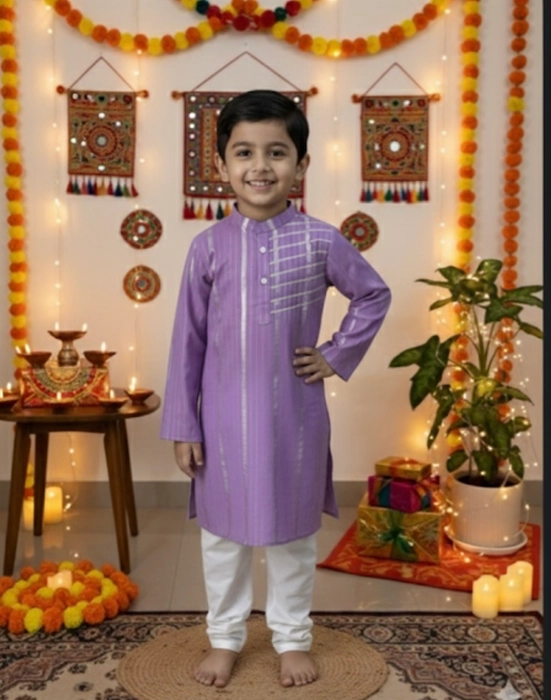 Make your child stand out with our Lavender Shine Kurta Pyjama Set, crafted for style and comfort. Featuring a rich lavender tone with a subtle shine, this ethnic wear is perfect for festive events, weddings, and cultural functions. The lightweight fabric ensures ease of movement and all-day comfort.